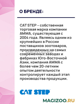 Информация о составе и ингредиентах, цветовом решении, технических и иных характеристиках, стране-изготовителе, внешнем виде и комплекте поставки товара носит справочный характер и основана на последних доступных к моменту публикации сведениях. Доставка данного товара осуществляется во все регионы РФ.Благодаря постоянному совершенствованию линии товаров, продукция CAT STEP предлагает широкий ассортимент наполнителей для взрослых кошек и маленьких котят, созданных из современных и безопасных материалов. Наполнители CAT STEP – это европейский стандарт качества и экономичности.