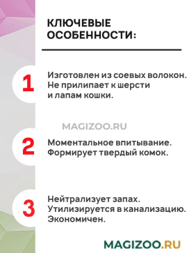Благодаря волокнистой структуре при попадании жидкости соевые гранулы образуют плотный комок, который легко удалить из лотка. Жидкость, попадая на гранулы, не растекается, не застаивается, и запах блокируется внутри наполнителя.