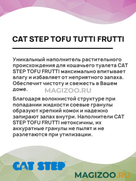 Уникальный наполнитель растительного происхождения для кошачьего туалета CAT STEP TOFU FRUTTI максимально впитывает влагу и избавляет от неприятного запаха. Обеспечит чистоту и свежесть в Вашем доме.