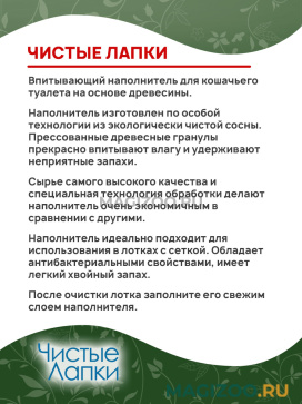 Наполнитель ЧИСТЫЕ ЛАПКИ благодаря своим высоким потребительским качествам и уникальности состава быстро завоевал любовь потребителей и занял одну из лидирующих позиций на Российском рынке. Продукция представлена двумя линейками в нескольких вариантах фасовки.
