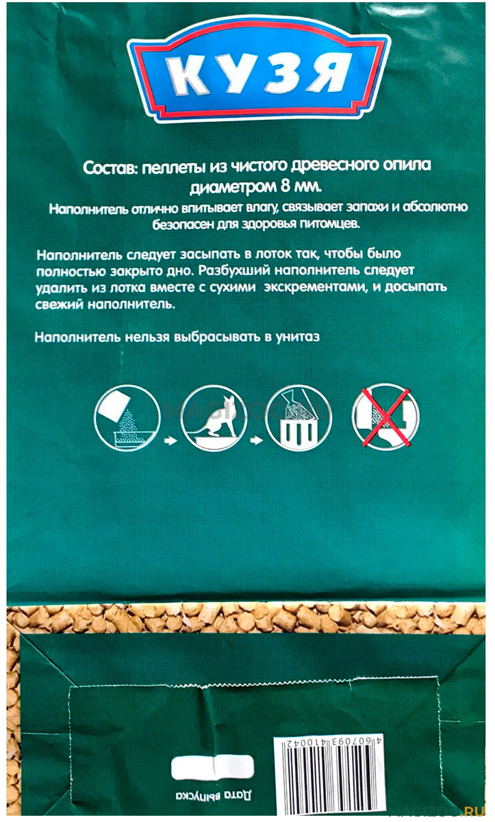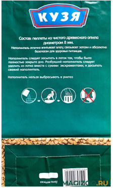 Наполнитель для кошачьего туалета изготовлен из обработанной древесины, спрессованные в гранулы по специальной технологии опилки, при попадании на них жидкости опилки рассыпаются в труху.