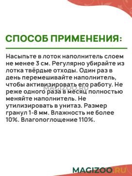 Способ применения: насыпьте в лоток наполнитель слоем не менее 3 см. Регулярно убирайте из лотка твёрдые отходы. Один раз в день перемешивайте наполнитель, чтобы активизировать его работу. Не реже одного раза в месяц полностью меняйте наполнитель. Не утилизировать в унитаз. Размер гранул 1-8 мм. Влажность не более 10%. Влагопоглощение 110%.