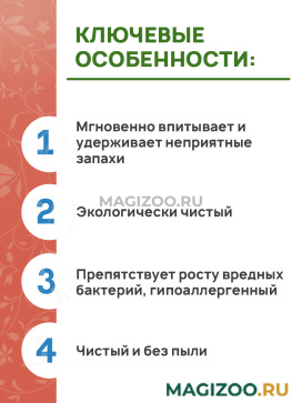 Наполнитель блокирует бактерии, которые распространяют неприятные запахи, и позволяет сохранять в помещении максимальную чистоту и комфорт не только для Вас, но и для Вашего чувствительного к запахам питомца.