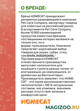 Бренд HOMECAT принадлежит динамично развивающийся компании Pet Care Company, импортеру товаров для животных на российский рынок.