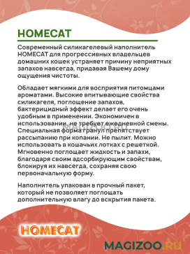 Современный силикагелевый наполнитель HOMECAT для прогрессивных владельцев домашних кошек устраняет причину неприятных запахов навсегда, придавая Вашему дому ощущения чистоты.