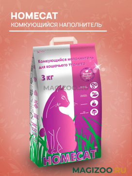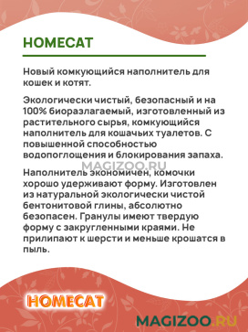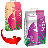 Торговая марка HOMECAT отечественного производства выпускает наполнители для кошачьего туалета разных типов: от впитывающих до комкующихся, от древесных до бентонитовых. Производитель заявляет, что HOMECAT – это серия высококачественных наполнителей с 100 % натуральным составом, эко упаковка, экономия расхода, отсутствие запахов и комфортная цена.