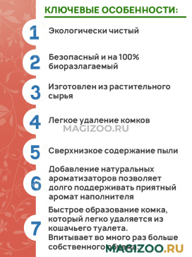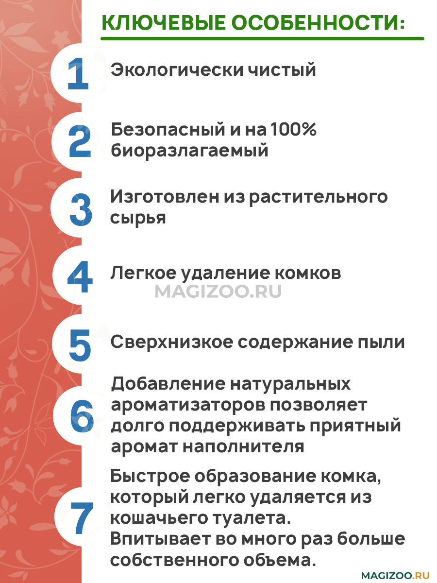 Разработан с учетом физиологии животного и поддерживает чистоту кошачьего туалета длительное время, подавляя запах и предотвращая рост бактерий. Обладает повышенными адсорбирующими свойствами, отлично удерживает влагу и запах внутри комка. Натуральное сырье характеризуется приятной мягкостью и максимальным отсутствием пыли, обеспечивает приятные ощущения для кошачьих лап и органов дыхания.