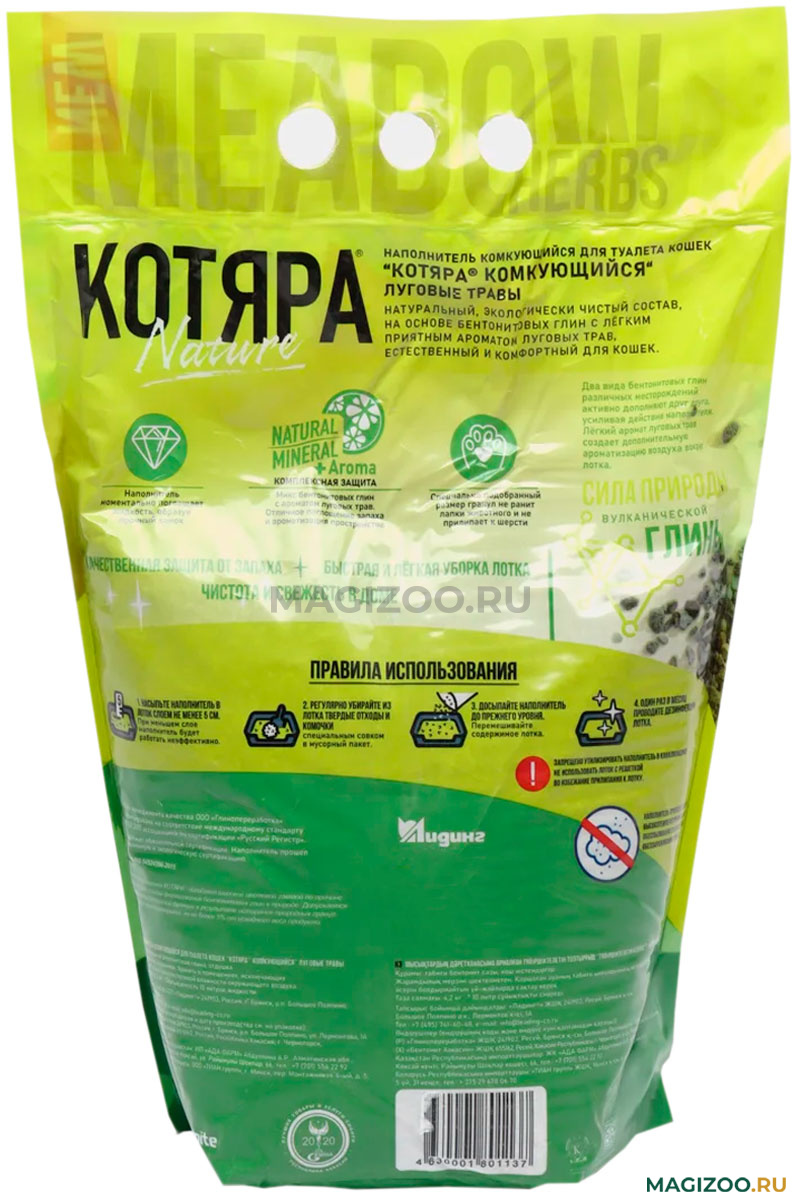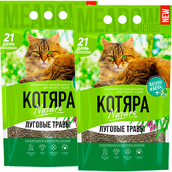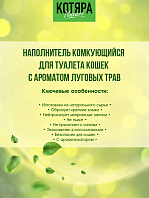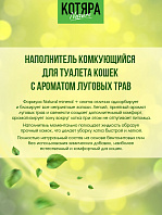 Комкующийся наполнитель КОТЯРА Луговые травы с легким приятным ароматом свежести луговых трав. Полностью натуральный состав на бентонитовых глин естественный и комфортный для кошек.
