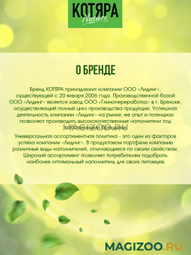 Информация о составе и ингредиентах, цветовом решении, технических и иных характеристиках, стране-изготовителе, внешнем виде и комплекте поставки товара носит справочный характер и основана на последних доступных к моменту публикации сведениях. Доставка данного товара осуществляется во все регионы РФ.Универсальная ассортиментная политика - это один из факторов успеха компании «Лидинг». В продуктовом портфеле компании различные виды наполнителей, отличающиеся по своим свойствам. Широкий ассортимент позволяет потребителям подобрать наиболее оптимальный наполнитель для своих питомцев.