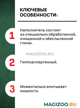 Наполнитель состоит из специально обработанной, очищенной и обеспыленной глины, благодаря которой шерсть Вашего питомца остается чистой.