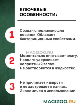 Основные свойства наполнителя №1 «For Girls»: обладает бактерицидными свойствами, препятствует размножению болезнетворных бактерий и организмов. Проходит гранулометрический контроль, очищен от пыли, экономичен в использовании. Устойчив к растворению, имеет длительный срок службы.