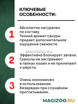 Гранулы тщательно от сортированы и не застревают в лапках животных, не прилипают к шерсти. В процессе использования никогда не превращается в вязкую массу. Наполнитель заботится о свежести и чистоте Вашего Дома и о комфорте Вашей кошки. Не причиняет вреда при случайном употреблении внутрь. Продукт очень экономичен в использовании и отвечает всем требованиям гигиены.
