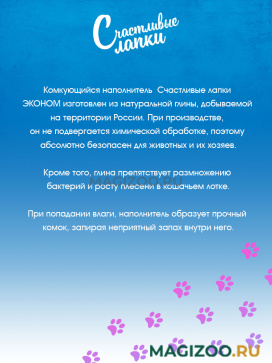 Комкующийся наполнитель Счастливые лапки ЭКОНОМ изготовлен из натуральной глины, добываемой на территории России. При производстве, он не подвергается химической обработке, поэтому абсолютно безопасен для животных и их хозяев.