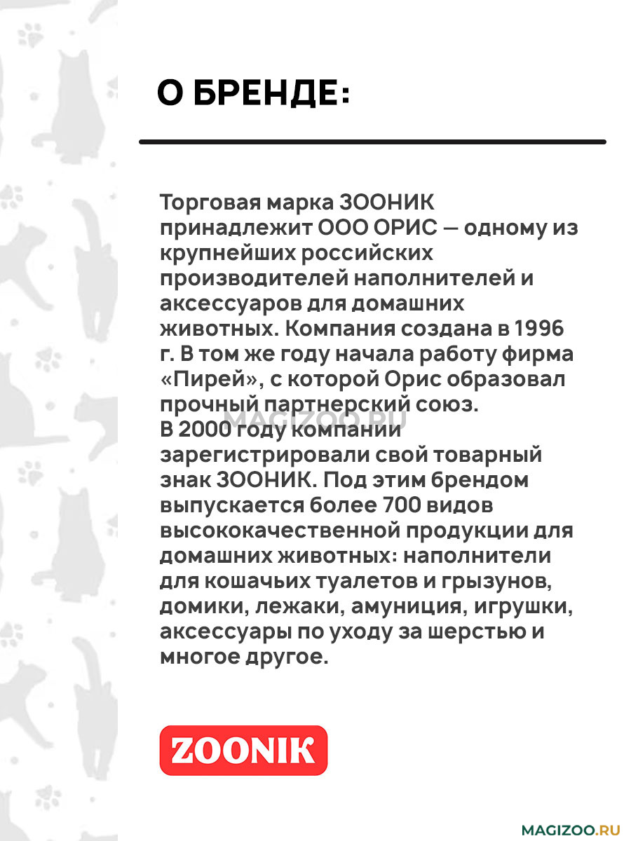 Информация о составе и ингредиентах, цветовом решении, технических и иных характеристиках, стране-изготовителе, внешнем виде и комплекте поставки товара носит справочный характер и основана на последних доступных к моменту публикации сведениях. Доставка данного товара осуществляется во все регионы РФ.В 2000 году компании зарегистрировали свой товарный знак ЗООНИК. Под этим брендом выпускается более 700 видов высококачественной продукции для домашних животных: наполнители для кошачьих туалетов и грызунов, домики, лежаки, амуниция, игрушки, аксессуары по уходу за шерстью и многое другое.