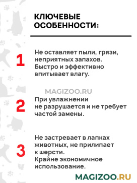 Размер гранул позволяет обеспечить поверхностное впитывание и формирование комочка, который легко удаляется, не прилипая ко дну лотка. Наполнитель не пылит и не прилипает к лапкам.