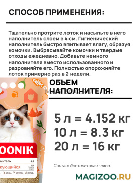 Гигроскопический продукт эффективно впитывает влагу, не позволяя ей дойти до дна лотка, что предотвращает образование микробов и характерных неприятных запахов. В отличие от других подобных материалов не пылит и не измельчается в процессе фасовки, транспортировки и использования.