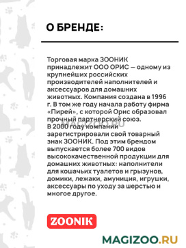 Торговая марка ЗООНИК принадлежит ООО ОРИС — одному из крупнейших российских производителей наполнителей и аксессуаров для домашних животных. Компания создана в 1996 г. В том же году начала работу фирма «Пирей», с которой Орис образовал прочный партнерский союз.