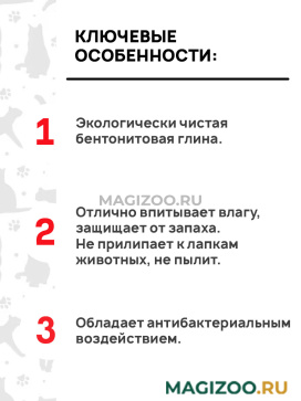 Бентонит является сильнейшим природным сорбентом, интенсивно поглощает запах и обладает антибактериальным воздействием. Размер гранул позволяет обеспечить поверхностное впитывание и формирование комочка, который легко удаляется, не прилипая ко дну лотка. Наполнитель не пылит и не прилипает к лапкам.