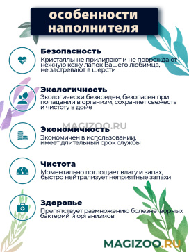 Кристаллы наполнителя безопасны для нежных кошачьих лапок: они не прилипают и не повреждают кожу лапок Вашего любимца, а так же не застревают в шерсти.
