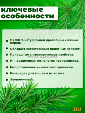Гранулы наполнителя произведены из экологически чистой древесины хвойных пород. Благодаря натуральному составу, они обладают естественным для кошек запахом и видом, а также природными антисептическими свойствами.