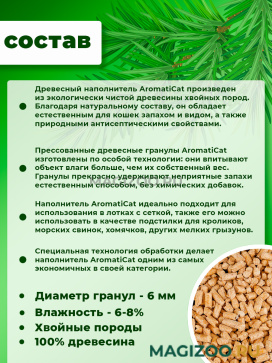Древесный наполнитель AromatiCat прекрасно справляется не только с «нежелательными» ароматами, но и впитывает влаги больше, чем собственный вес.