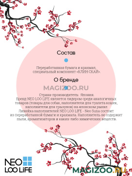 Линейка наполнителей NEO LOO LIFE - Neo Suna состоит из переработанной бумаги и крахмала. Наполнитель не содержит пыли, ароматизаторов и каких-либо химических веществ.