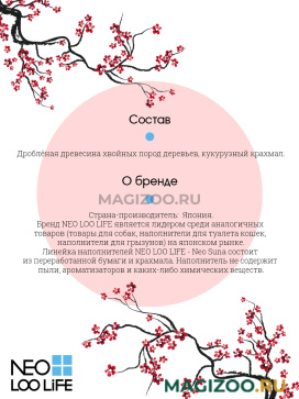 Информация о составе и ингредиентах, цветовом решении, технических и иных характеристиках, стране-изготовителе, внешнем виде и комплекте поставки товара носит справочный характер и основана на последних доступных к моменту публикации сведениях. Доставка данного товара осуществляется во все регионы РФ.Линейка наполнителей NEO LOO LIFE - Neo Suna состоит из переработанной бумаги и крахмала. Наполнитель не содержит пыли, ароматизаторов и каких-либо химических веществ.