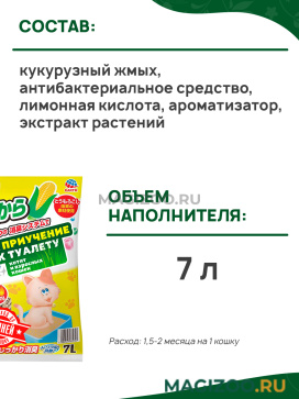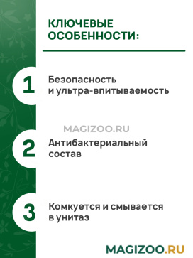 Растительный наполнитель на основе кукурузы быстро впитывает влагу и неприятные запахи. Кукурузные волокна абсолютно безопасны при случайном попадании внутрь организма.
