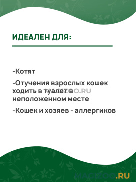 Нежный аромат луговых трав освежает помещение и тонизирует нервную систему, а также помогает приучить кошку к лотку благодаря ассоциации с природным туалетом.