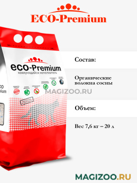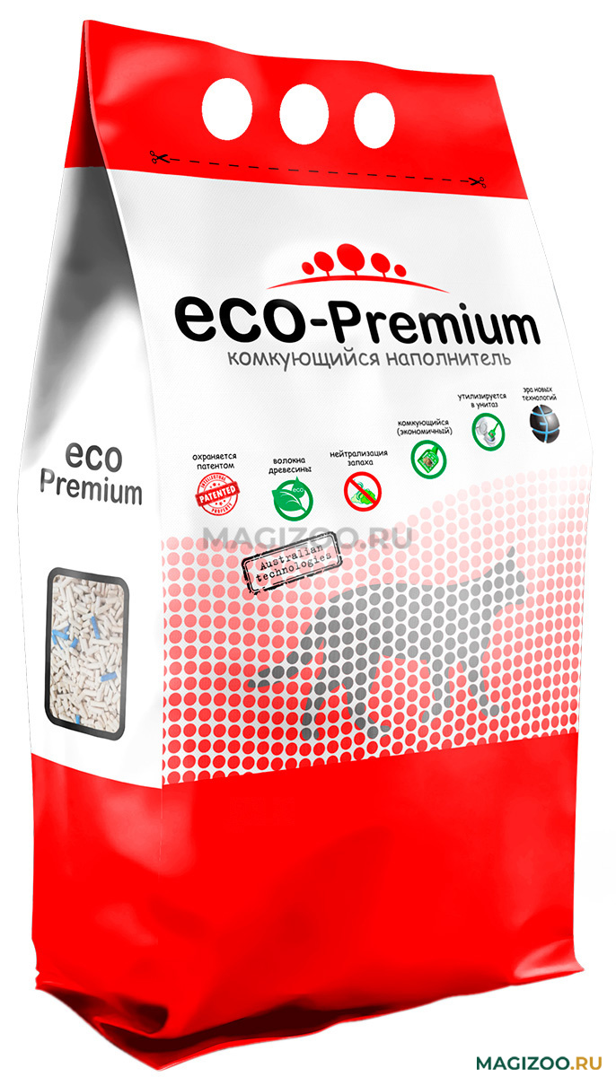 Наполнитель ECO-Premium изготавливается из органических волокон хвойных пород деревьев по запатентованной Австралийской формуле и технологии производства, которая позволяет полностью нейтрализовать неприятные запахи, сформировать плотный комок и обеспечивает антибактериальный эффект.