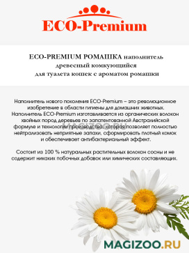 Наполнитель ECO-Premium изготавливается из органических волокон хвойных пород деревьев по запатентованной Австралийской формуле и технологии производства, которая позволяет полностью нейтрализовать неприятные запахи, сформировать плотный комок и обеспечивает антибактериальный эффект.