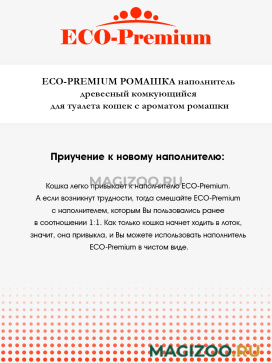 Кошка легко привыкает к наполнителю ECO-Premium. А если возникнут трудности, тогда смешайте ECO-Premium с наполнителем, которым Вы пользовались ранее в соотношении 1:1. Как только кошка начнет ходить в лоток, значит, она привыкла, и Вы можете использовать наполнитель ECO-Premium в чистом виде.