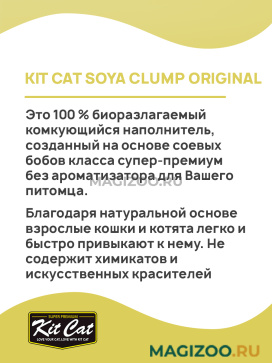 Все материалы, входящие в состав наполнителя KIT CAT SOYA CLUMP, биоразлагаемы и не содержат веществ, причиняющих вред природе и окружающей среде.