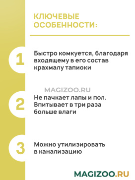 Наполнитель не пылит, не прилипает к лапам и шерсти, безопасен для котят, подходит для длинношерстных кошек и некоторых экзотических животных.