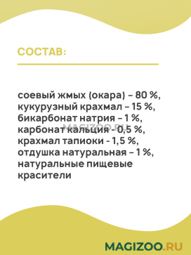 Соевый жмых (окара) – 80 %, кукурузный крахмал – 15 %, бикарбонат натрия – 1 %, карбонат кальция - 0,5 %, крахмал тапиоки - 1,5 %, отдушка натуральная – 1 %, натуральные пищевые красители.