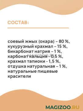 Соевый жмых (окара) – 80 %, кукурузный крахмал – 15 %, бикарбонат натрия – 1 %, карбонат кальция - 0,5 %, крахмал тапиоки - 1,5 %, отдушка натуральная – 1 %, натуральные пищевые красители.