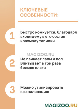 Наполнитель не пылит, не прилипает к лапам и шерсти, безопасен для котят, подходит для длинношерстных кошек и некоторых экзотических животных.