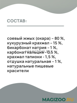 Соевый жмых (окара) – 80 %, кукурузный крахмал – 15 %, бикарбонат натрия – 1 %, карбонат кальция - 0,5 %, крахмал тапиоки - 1,5 %, отдушка натуральная – 1 %, натуральные пищевые красители.