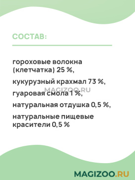 Состав: гороховые волокна (клетчатка) 25 %, кукурузный крахмал 73 %, гуаровая смола 1 %, натуральная отдушка 0,5 %,натуральные пищевые красители 0,5 %.
