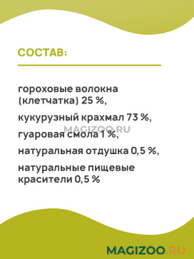 Состав: гороховые волокна (клетчатка) 25 %, кукурузный крахмал 73 %, гуаровая смола 1 %, натуральная отдушка 0,5 %,натуральные пищевые красители 0,5 %.