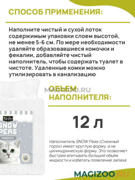 Наполнитель SNOW Peas (Снежный горох) имеет круглую форму, а не цилиндрическую форму. Это позволяет быстрее впитывать больший объём жидкости и избегать появление запаха.