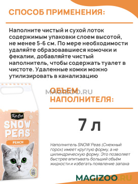 Наполнитель SNOW Peas (Снежный горох) имеет круглую форму, а не цилиндрическую форму. Это позволяет быстрее впитывать больший объём жидкости и избегать появление запаха.