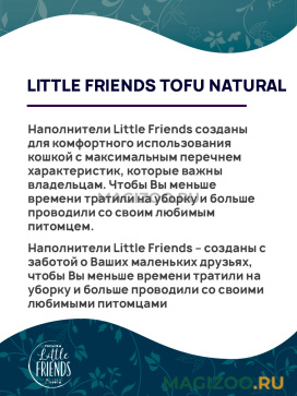 Little Friends Tofu Natural - высококачественный наполнитель Premium сегмента, разработанный по современным технологиям из сертифицированных, экологически чистых и безопасных материалов.
