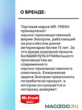 Формулы MR. FRESH созданы совместно с европейской лабораторией Veterinary Bio (Германия). Ассортимент представлен различной целевой направленности. Состав всех препаратов MR. FRESH безопасен для здоровья животных и детей. Препараты не содержат хлора, фтора и других химически агрессивных компонентов.