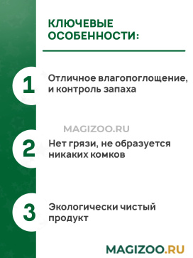 Благодаря высоким адсорбционным свойствам полностью поглощает все неприятные запахи, замедляет развитие болезнетворных организмов, отлично впитывает влагу. Влага, попадая в лоток, быстро проникает вниз и впитывается нижними слоями наполнителя.