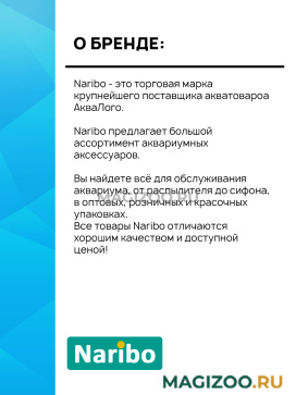 Информация о составе и ингредиентах, цветовом решении, технических и иных характеристиках, стране-изготовителе, внешнем виде и комплекте поставки товара носит справочный характер и основана на последних доступных к моменту публикации сведениях. Доставка данного товара осуществляется во все регионы РФ.Naribo предлагает большой ассортимент аквариумных аксессуаров. Вы найдете всё для обслуживания аквариума, от распылителя до сифона, в оптовых, розничных и красочных упаковках.