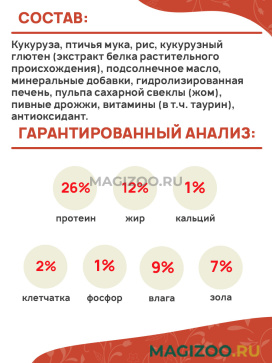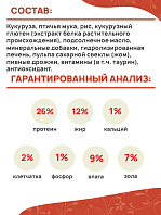 Кукуруза, птичья мука, рис, кукурузный глютен (экстракт белка растительного происхождения), подсолнечное масло, минеральные добавки, гидролизированная печень, пульпа сахарной свеклы (жом), пивные дрожжи, витамины (в т.ч. таурин), антиоксидант.