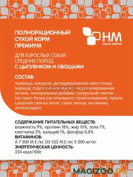 Полнорационный, сбалансированный корм для взрослых собак средних пород с курицей и овощами.