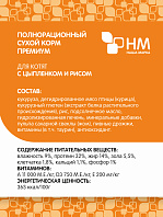 Пшеница, кукуруза, дегидрированное мясо птицы (курица), подсолнечное масло, гидролизированная печень, минеральные добавки, кукурузный глютен (экстракт белка растительного происхождения), пульпа сахарной свеклы (жом), сухие овощи, витамины, антиоксидант.