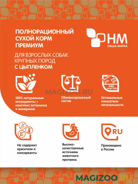Полнорационный, сбалансированный корм для взрослых собак крупных пород с курицей.
